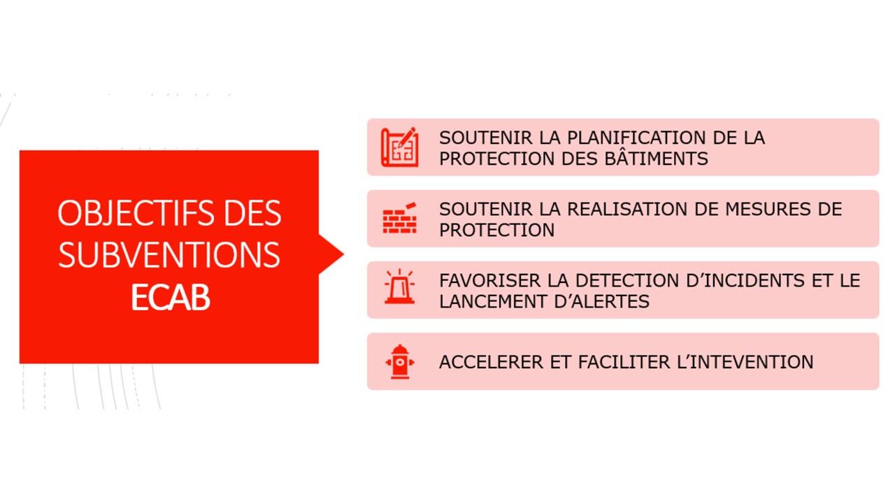 Les mesures subventionnées par l’ECAB visent à prévenir les risques, renforcer la sécurité des bâtiments, alerter en cas d’incident et faciliter l’intervention. En soutenant le propriétaire dans la protection de son bâtiment, l’ECAB poursuit également l’objectif de maintenir les primes à un niveau stable.